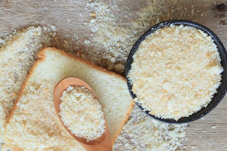 fork on piece of sweet toast with sugar on wooden plate in vintage color tone