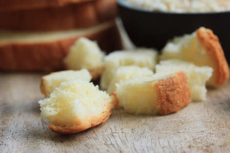 Top view on crispy bread cubes. Pile of croutons from white bread