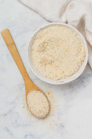 Panko Japanese crispy breadcrumbs in a white plate on a marble background close-up. A crumb for cooking. Selective Focus, top view