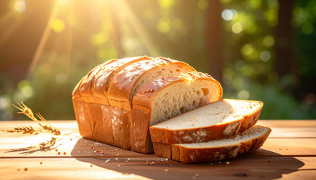 A loaf of freshly baked bread with slices is displayed on a wooden table in an outdoor setting with sunlight.