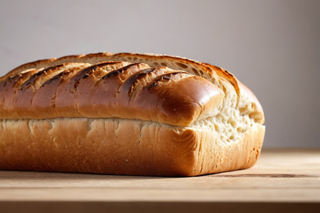 Elegant presentation of a loaf of bread with a soft, golden crust, set on a white background with a shadow effect to create a visually appealing contrast