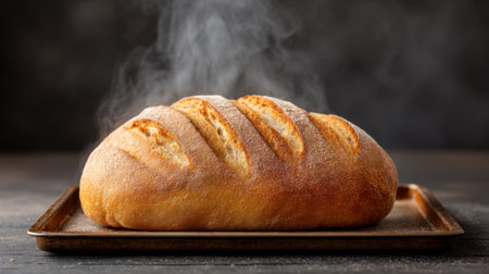 A stunning loaf of freshly baked bread rests on a tray, emanating smoky steam, evoking warmth and comfort, perfect for culinary inspiration and food photography.