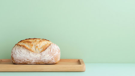A loaf of crusty bread sits on a wooden tray illuminated by soft light against a light green wall, showing its golden crust.