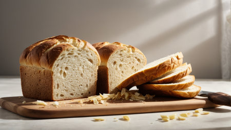 A freshly baked loaf of bread sliced on a wooden cutting board in warm light