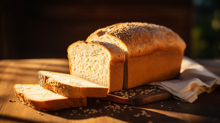 A loaf of sliced bread on top of a cutting board. AI generative image.