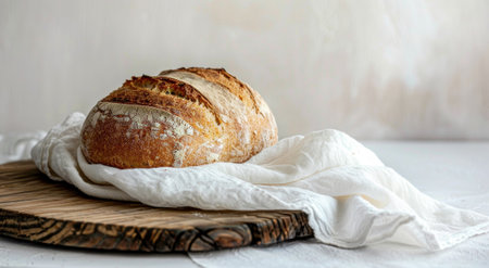 Artisan bread with a golden crust placed on a wooden cutting board, accompanied by a linen cloth and scattered herbs. Soft natural light enhances the rustic ambiance.
