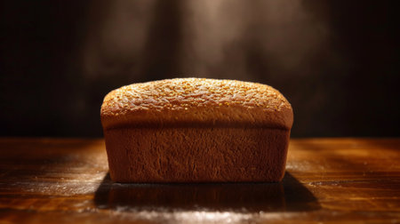 Freshly baked bread loaf with a golden crust showcased on a rustic wooden.