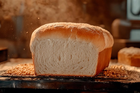 Soft, golden-brown bread sits proudly on a cooling rack, flour dust dancing in the warm light of the kitchen. The aroma fills the room as the crust captures the essence of comfort and home.