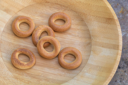 Crispy Bagel Shaped Biscuits in a Wooden Bowl, Traditional Russian Sushki Snack.