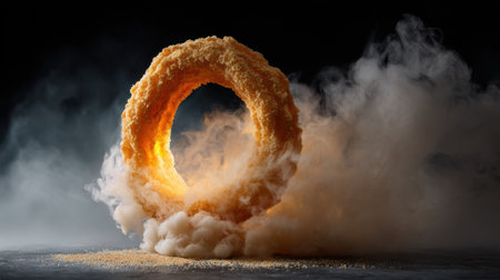 This stunning image features a golden fried onion ring emerging from a cloud of smoke, creating a dramatic visual perfect for food-themed projects.