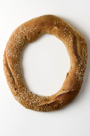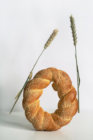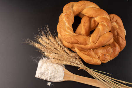 AI Generated. Freshly Cut Sesame Bread Ring on Dark Surface Background