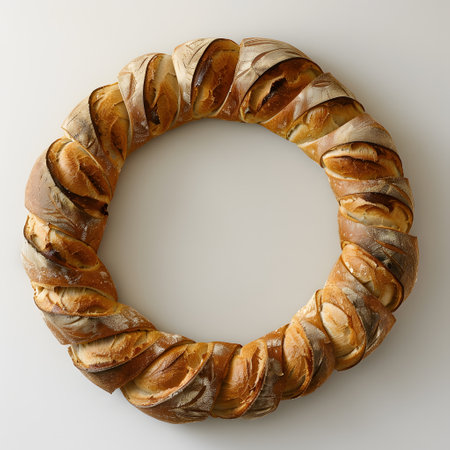 A brown bread wreath rests on a white surface, resembling a creative arts piece