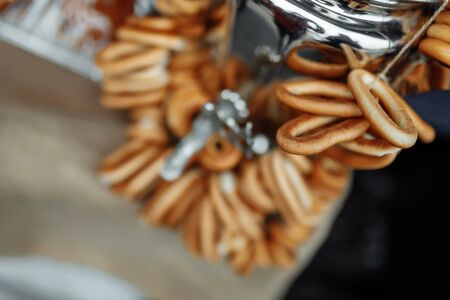 Fresh delicious bread rings (bagels, sushki or baranki) on a samovar