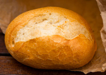 Fresh baked bread wrapped in paper, on wooden background.