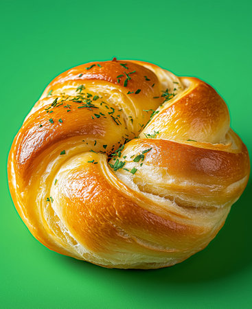A Delicious bun with cheese and herbs on vibrant green background, showcasing its golden brown texture and appealing swirl. Perfect for food lovers
