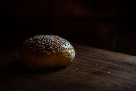 Fresh baked hamburger bun on wooden table ready to cook hamburger