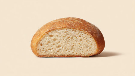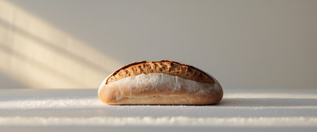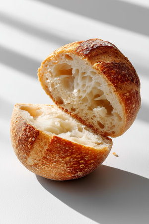 Sourdough round is cut in half revealing light and airy crumb. Minimalist setting with soft white light and subtle shadows. Concept of baking, artisan bread, culinary arts.