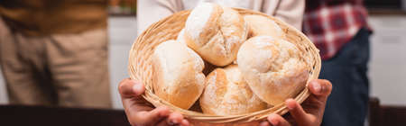 Panoramic crop of african american child holding basket with buns at home