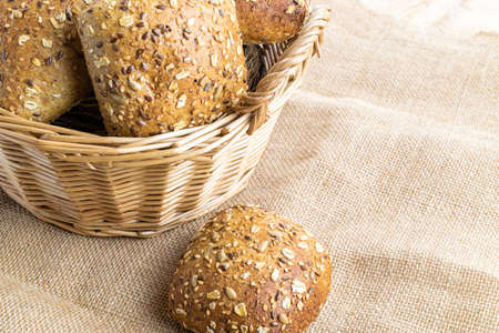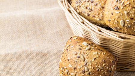 Whole grain bread rolls in a basket for Breakfast or Burgers. Food background with copy space, top view.