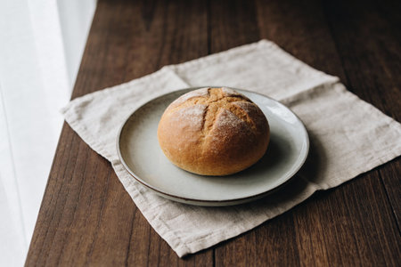 A single, golden-brown bread roll sits on a ceramic plate, presented on a textured wooden table with a linen cloth underneath