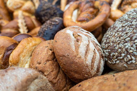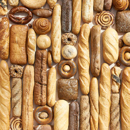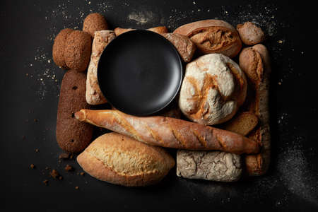 Homemade natural breads. Different kinds of fresh bread as background, top view with copy space.