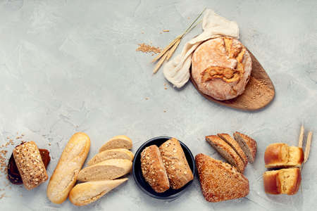 Various types of fresh baked bread on light gray background. Top view, flat lay, copy space