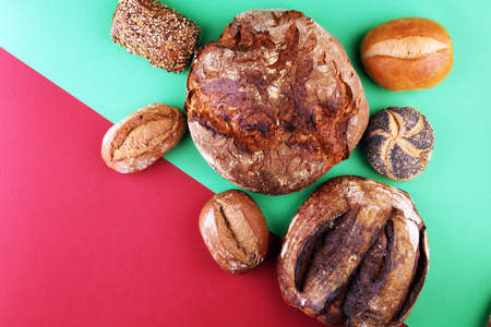 Different kinds of bread and bread rolls flat lay on colored paper. Kitchen or bakery poster design.