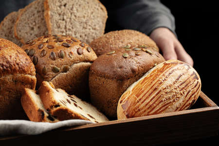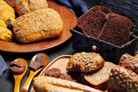 Various types of breads, fresh​ bread Cereal and chocolate, arranged on a basket. Arrange lowlight and darklight lighting.