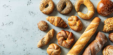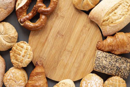 Bakery - different kinds of breadstuff. Bread rolls, baguette, bagel, burger bun and croissant captured from above (top view, flat lay). Gray background with free copy (text) space.