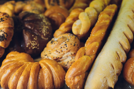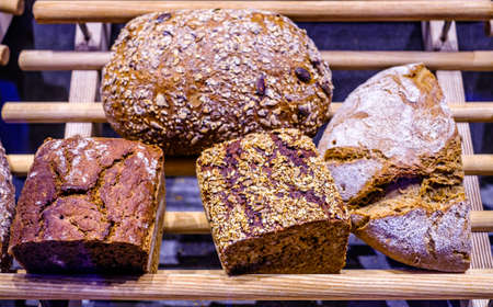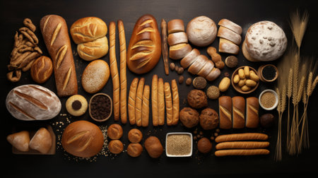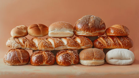 Various bread types stacked, plantbased ingredients, natural foods in cuisine