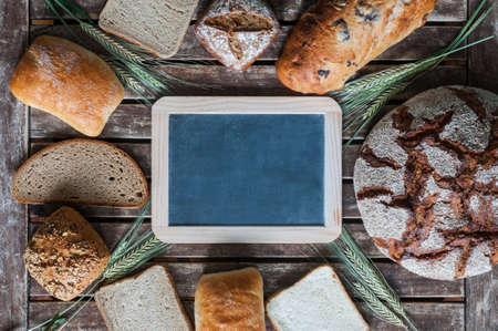 Various types of bread with ears of corn in the middle is a blackboard with copy space photographed on a wooden table in flat lay.