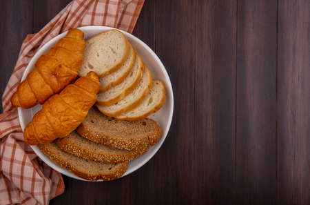 top view of breads as sliced seeded brown cob baguette and croissants in plate on plaid cloth on wooden background with copy space
