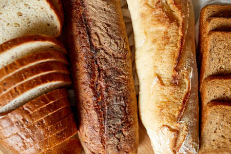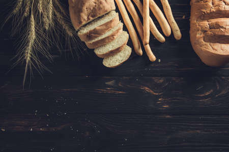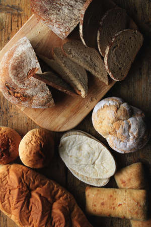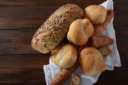 Top view of various kinds of bread on a wooden surface. Close up Concept of homemade bread, small bakery, natural farm products, local food, domestic production. Healthy and tasty organic food.