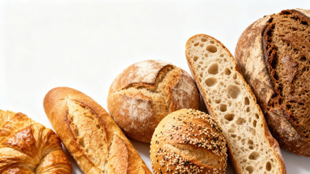 View of a diverse range of baked goods, including loaves, rolls, and a croissant, arranged against a bright white backdrop.