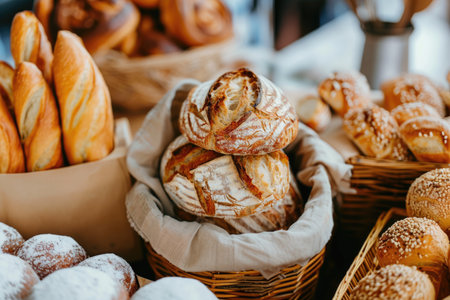 Assorted Fresh Baked Bread in Rustic Baskets at a Bakery Display.