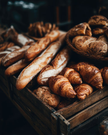 A rustic wooden crate filled with freshly baked bread and croissants showcases the art of local baking, appealing to culinary enthusiasts and food lovers.