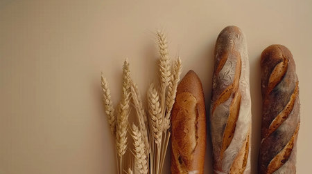 Freshly sliced baguette and French buns with wheat ears on a neutral beige backdrop