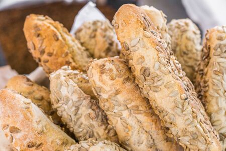 Top view of a bunch of baking on a wooden table. Top view of a crispy pastry strewn with seeds. Buns and bread sticks lie on a wooden table. Buns of wheat and rye flour lie on bread sticks.
