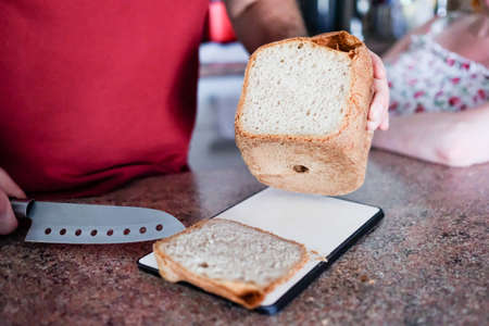 A woman use knife to slice soft and sticky delicious white bread on wood cutting board prepare breakfast for her family on wooden table in the morning with warm sun light. Homemade bakery concept.