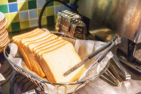White toaster with white bread in a bright kitchen, high key, vertical copy space.