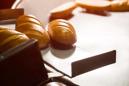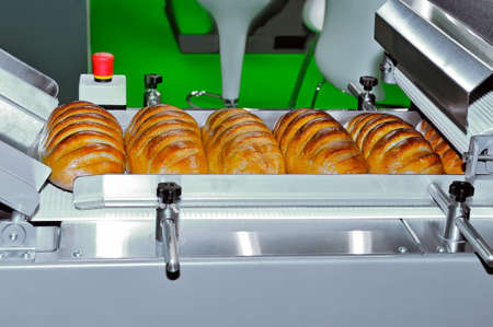 Fresh hot baked breads on automated production line bakery. Manufacture industrial