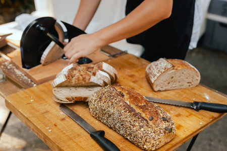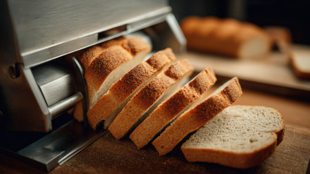 A close-up of a modern bread slicing machine in action, showcasing freshly sliced loaf of bread on a rustic wooden countertop. Perfect for food lovers.