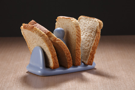 Toasted bread standing upright in a metal toast rack, with soft kitchen background