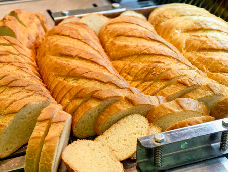 Freshly baked bread loaves sliced and ready for serving in a cozy bakery setting during the morning hours