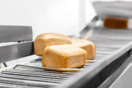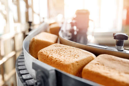 Baked square breads on conveyor food automatic production line bakery from hot oven, sunlight