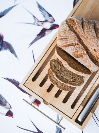 Bread on a beautiful wooden board and on a tablecloth with birds