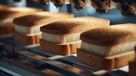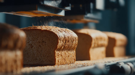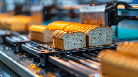 industrial food processing, an automated bread slicer efficiently and precisely processes food in a bakery, increasing productivity and accuracy in food preparation