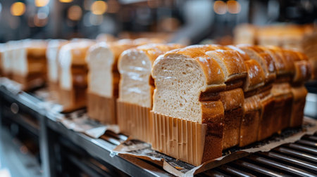 The image shows an assembly line of freshly baked bread loaves in a modern bakery, emphasizing the industrial process and quality control in food production.