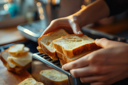 A beautiful composition featuring two slices of bread toasting in a modern toaster, accompanied by soft textures and natural elements, perfect for culinary inspiration.