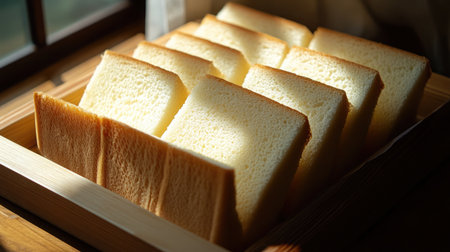 A beautiful display of freshly sliced white bread arranged in a wooden basket. The warm light highlights the soft texture, making it perfect for any meal or cozy setting.